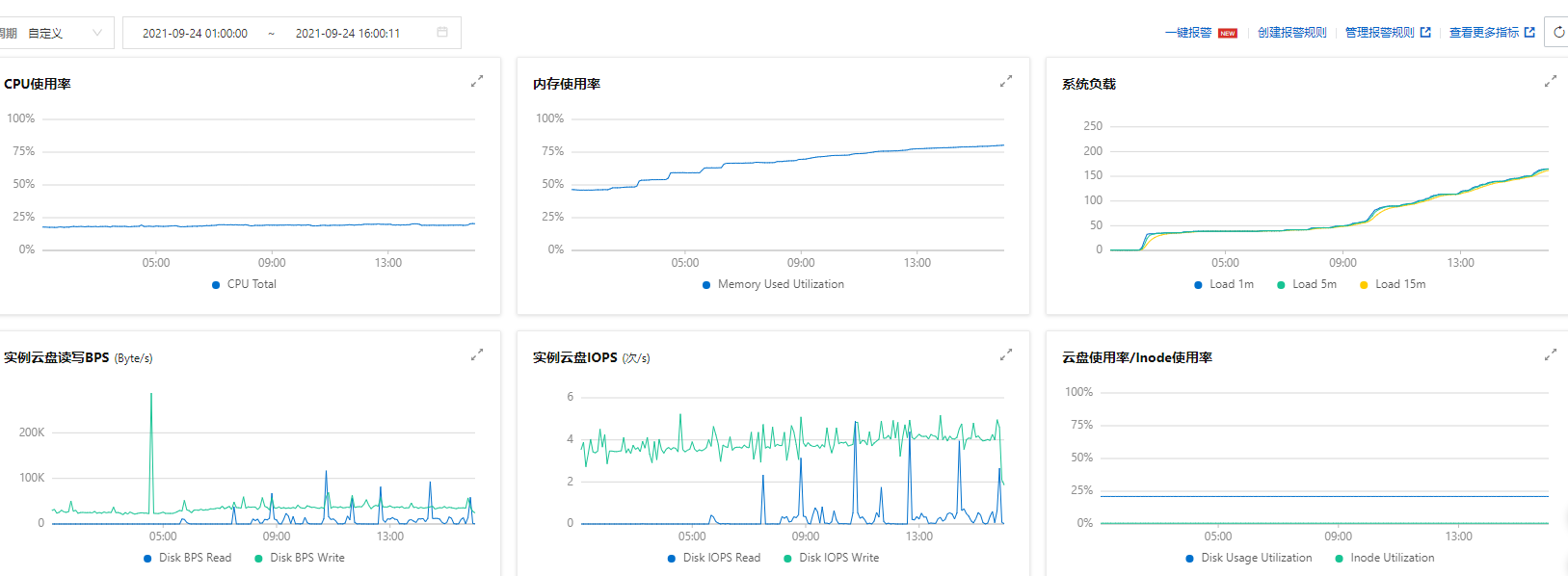 系统监控发现机器负载异常的高,如下图所示,从 1 点开始,由不到 1 的负载到后面超 100,负载、内存不断的飙高,但 CPU 使用率却几乎没怎么变化过。